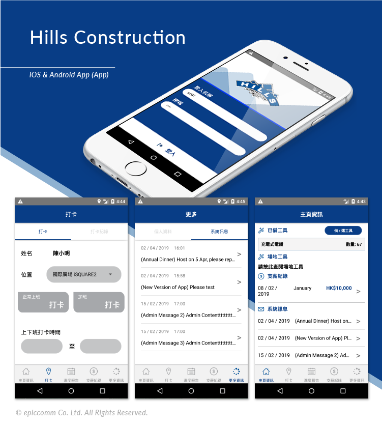 Provide a platform that can borrow / return tool, take and check the attendance record, and project progress management. Also, can check the salary record and system message.